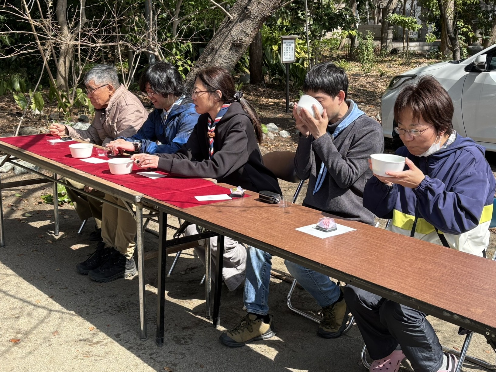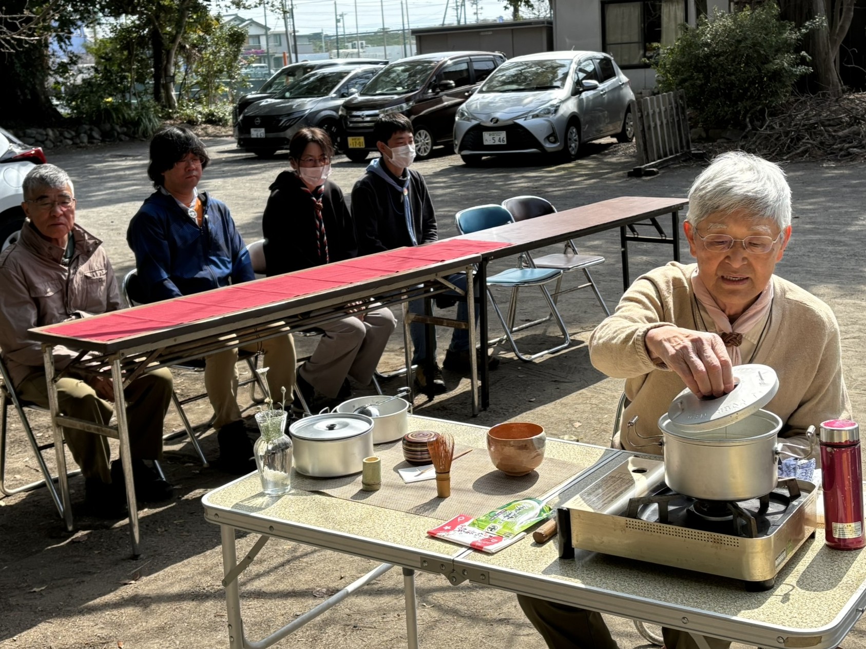 定形外訓練第2日目は、「ボーイスカウト清水流お茶会」と銘打って、お抹茶の野点を体験して「お茶の心」と「ボーイスカウト」を見つめました。お茶会終了後参加者達とコミッショナーが一年間のら運テーブルを振り返り、次年度に向けた確認をしました。