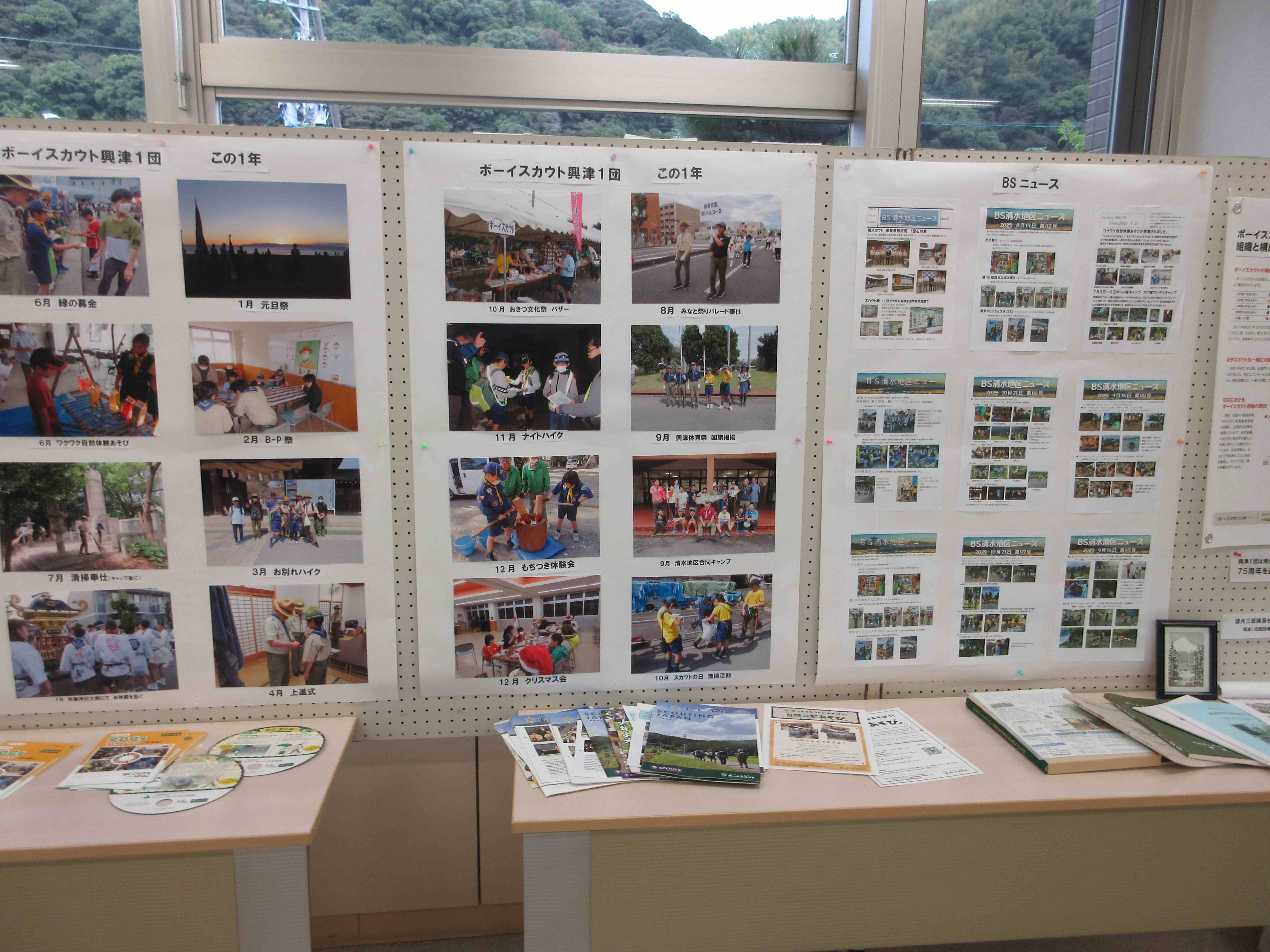 おきつ文化祭に1団のこの一年の活動を紹介する写真の展示とBSニュースそして、県連のパネルでスカウトの活動紹介を行いました。発団75周年のことし、創立者の望月三郎隊長を偲ぶコーナーももうけました。 雨天の為外でのバザーは中止となりました。