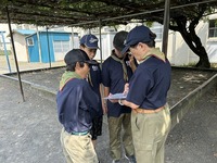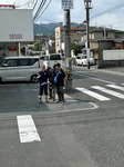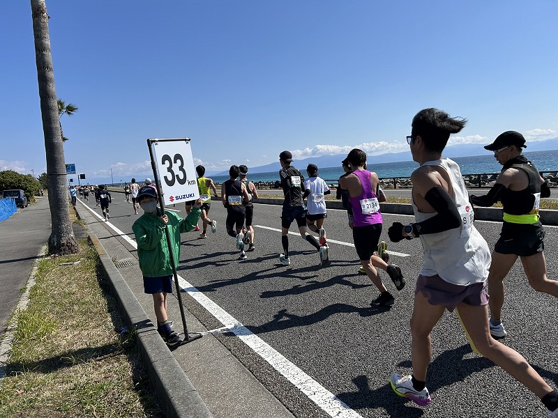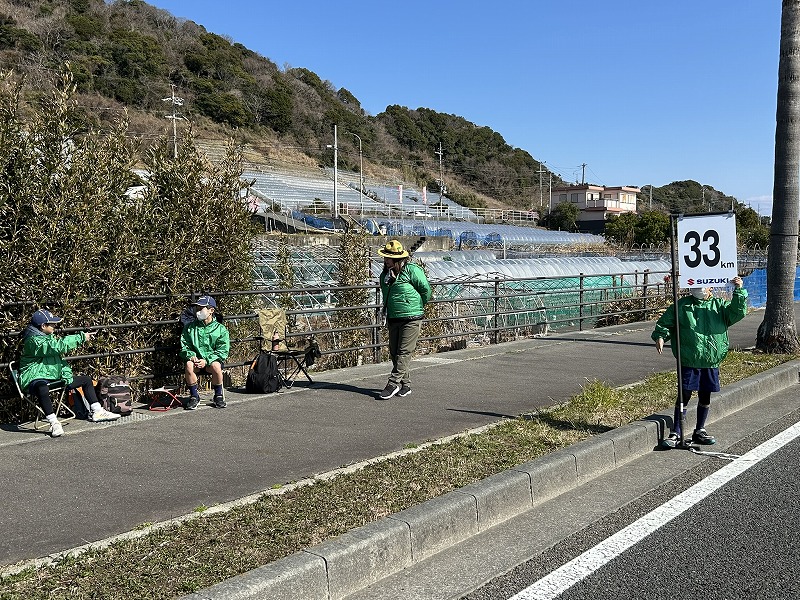 快晴の久能街道、カブスカウトは静岡マラソン33Kmポストの表示の奉仕活動を体験しました